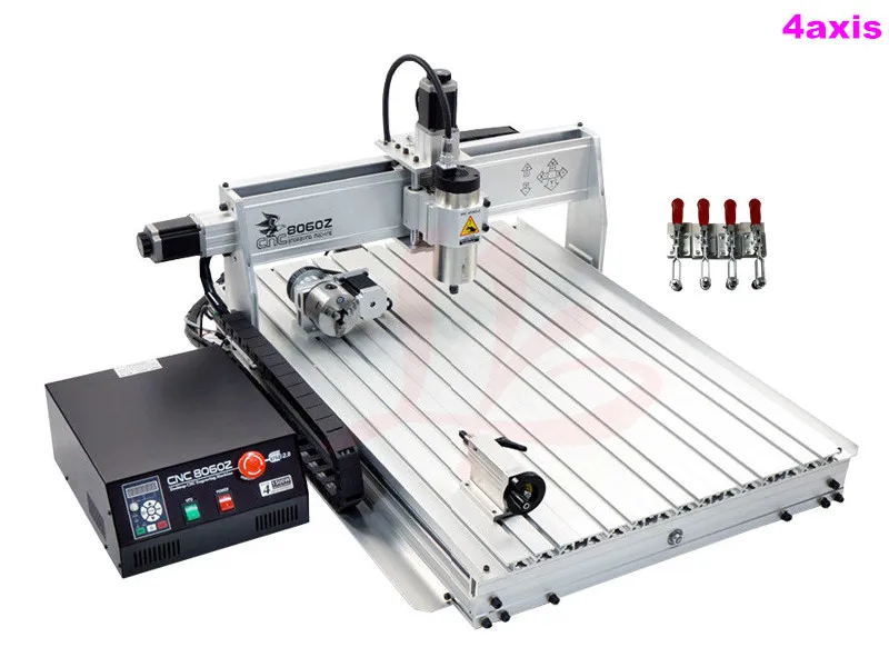[32872083742] 2200W spindle 4axis CNC 8060 ER20 collet USB portCNC Router machine Engraving Drilling and Milling Machine Introduction The CNC router is suitble for Industry, Technology Research, Advertising Design, Arts Creation, Teaching, Student Project and Hobby Purposes.The cnc router is designed for large area engraving work such as Industrial or Hobby Prototype Building, Building Model Making, PCB, Advertising Signs, Artwork, Crafts, Aircraft Models, RC Model parts, etc. So, you can do engraving work at office or home. Model and Technical Parameters MODEL 8060Z-2200W USB Attribute 4axis Axis 4axis Interface USB port Limit switch Yes Tool auto-checking With control handle No Spindle Motor: 2200W Type of screw Ball screw Weigh 90 Machine Dimensions: 1120X880X520mm Rack material: 6061 and 6063 Hard aluminum alloy (The unique and dedicated mold extrusion profiles, Let counterfeiters dwarfs.) Engraving area: 790X585mm Z-Axis Stroke: 65mm, Engraving depth depends on the length of the tool edge Acceptable material thickness: ≤ 90mm Rail type: Chromeplate shaft + Linear Bearings, Surface hardening 61HRC Type of screw: Ball screw 1605, Pitch 4mm Spindle motor: 2200W Powerful Brushless frequency spindle Collet type: ER20 Collet Stepper motor and drive: 60BYGH-4.2A, Each axis independently driven Maximum operating speed: 4000mm/min (Engraving speed: 300-3000mm/min) Repeat positioning Accuracy: 0.03mm Software Compatability: Mach3/Emc2/Kcam, (Type3,Wentai, ArtCAM, coppercam) Command code: G code/.nc/.ncc/.tab/.txt Rotation Axis (4th Axis) Description: Center height: H = 60mm Maximum turning diameter: ≤ 110mm Deceleration ratio: 3:1 Stepper motor: NEMA23BHH76-3A Weight: 4.2KG Packing list:1× Engraving machine1× Control box1× Power cable1× USB port cable1× Tool package4× clamps1× tool auto-checking instrument1× Rotation axis1× water pump1× CD of manual and software MACH3 (if not get, may be lost in customs, please contact us)